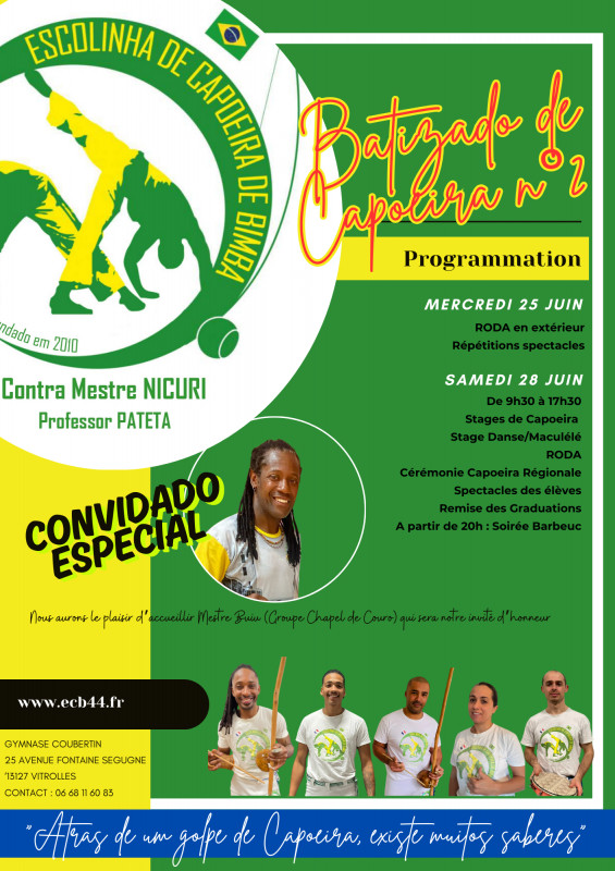- Samedi 28 juin de 9h30 à 17h30, organisation de stages (capoeira, maculélé, danse) toute la journée avec des invités (profs et maitres venant de groupes extérieurs) et le maître du groupe Contra Mestre NICURI. En milieu d'après midi, nous présenterons nos spectacles et terminerons par la cérémonie de remise de s graduations.